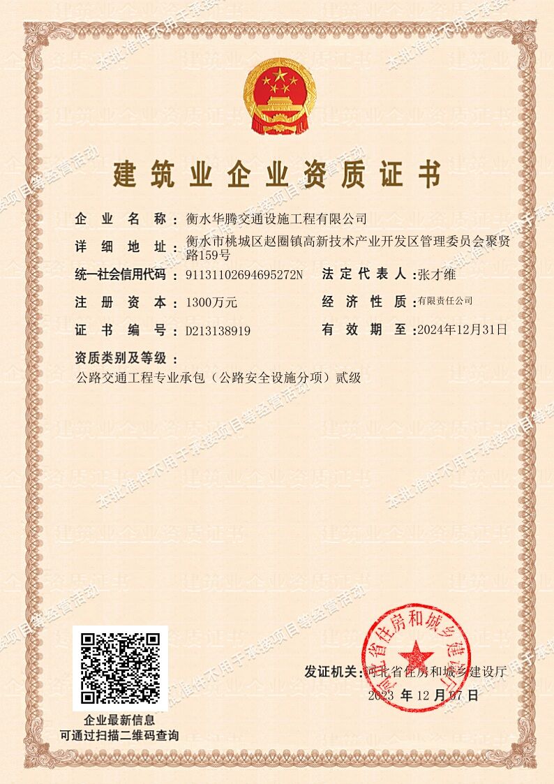 衡水華騰交通設(shè)施工程有限公司是一家公路工程綜合性企業(yè),具備河北省住房和城鄉(xiāng)建設(shè)廳核發(fā)的建筑業(yè)企業(yè)資質(zhì)證書(shū)(公路交通工程承包貳級(jí)),本公司承擔(dān)公路標(biāo)線、標(biāo)志、護(hù)欄、隔離柵、防眩板工程施工及按裝,并生產(chǎn)常溫型丙烯酸公路涂料、熱熔公路涂料、突起震動(dòng)涂料,以上產(chǎn)品完全由我公司生產(chǎn)合成完成,達(dá)到交通部JT/T280-2......